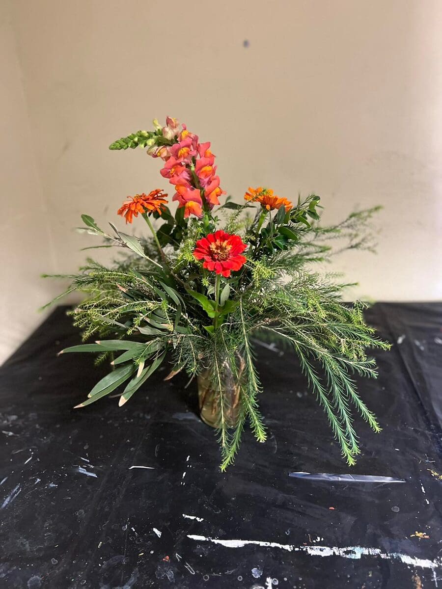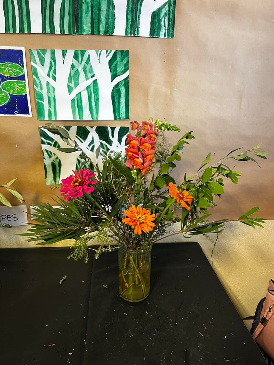 On Wednesday, the participants created fresh floral arrangements using vibrant zinnias, snapdragons, and green foliage—focusing on form, colour, and balance in their design.