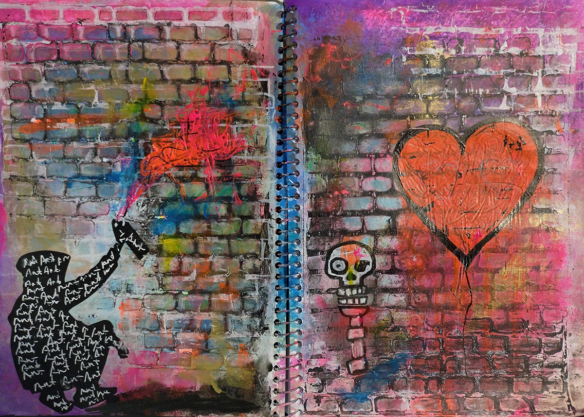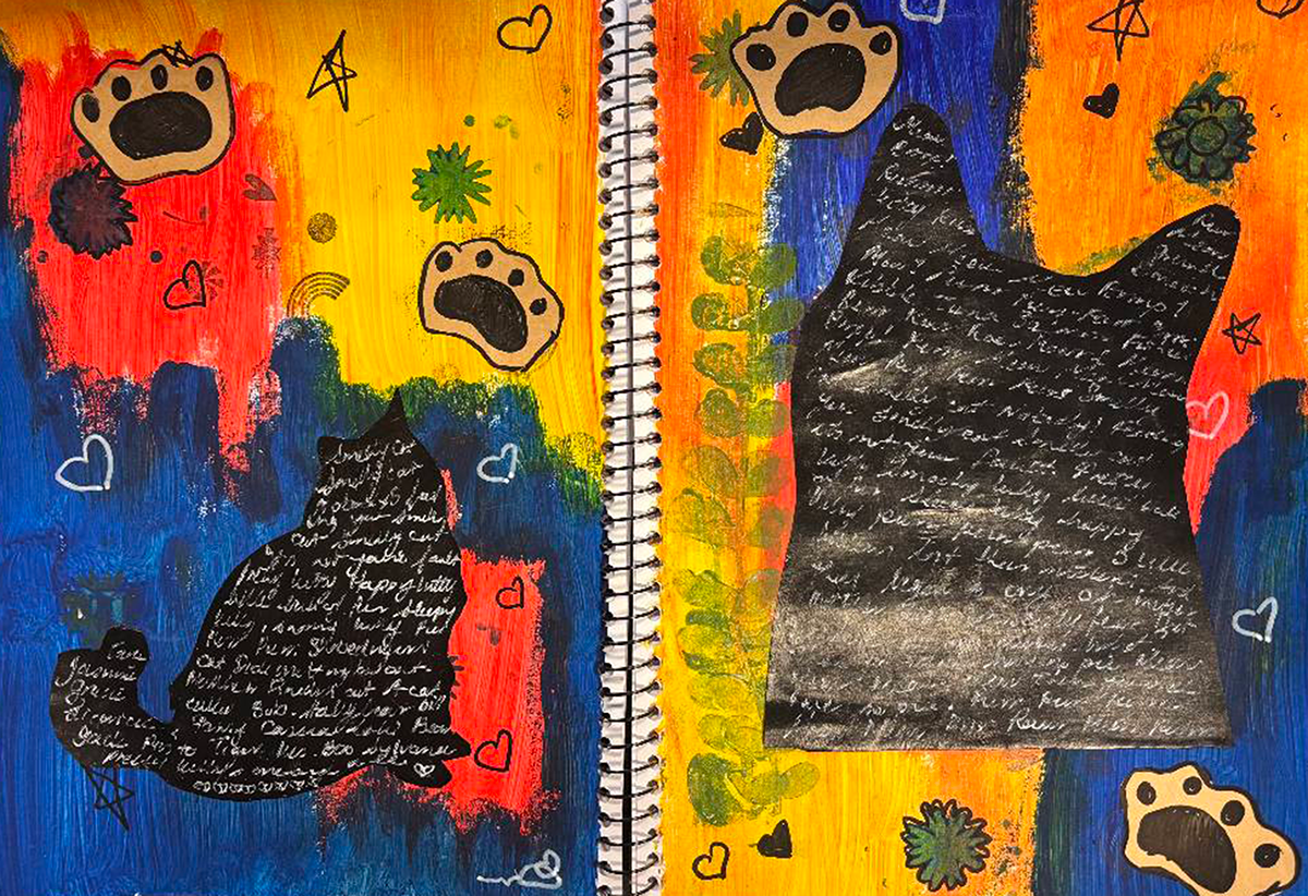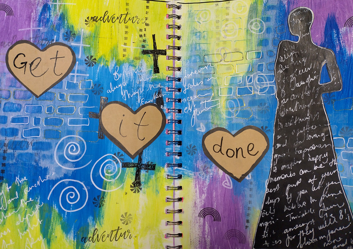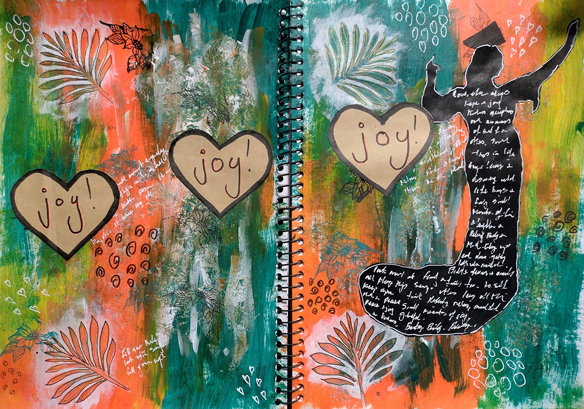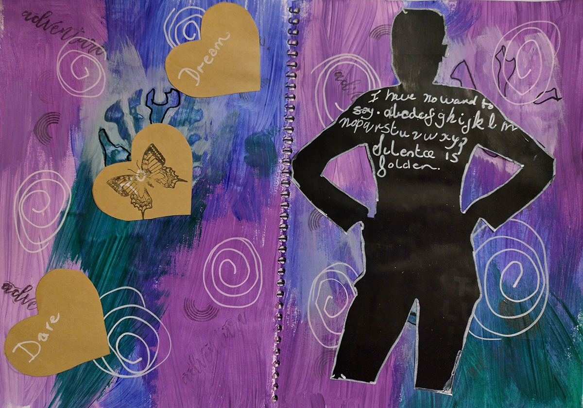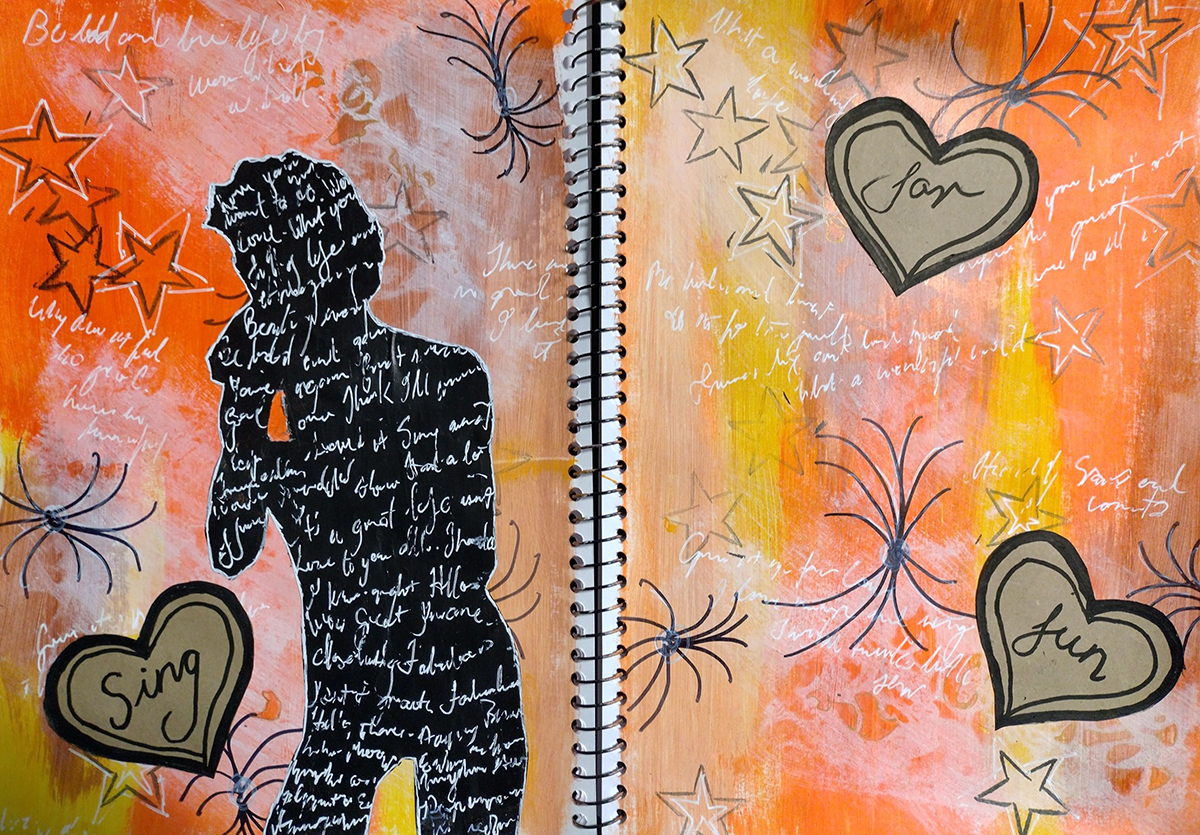Creating backgrounds with acrylic paint, some reverse stenciling and mark making over the paint and finished off with a silhouette image filled with text.
