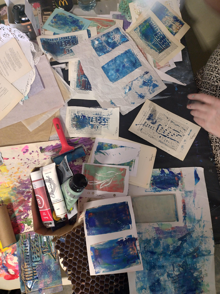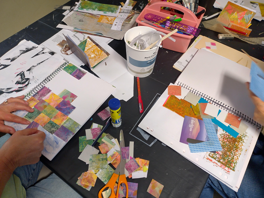 Studio Blog Art Journaling, Monday 24th, today participants explored the wonderful world of Gel Plate printing to create collage papers for their next project-DIY mini journals Many ooohs and ahhhhs were heard throughout the studio as they pulled their images off the plates. Using household objects and packaging supplies to create texture and interest on their pages. […]