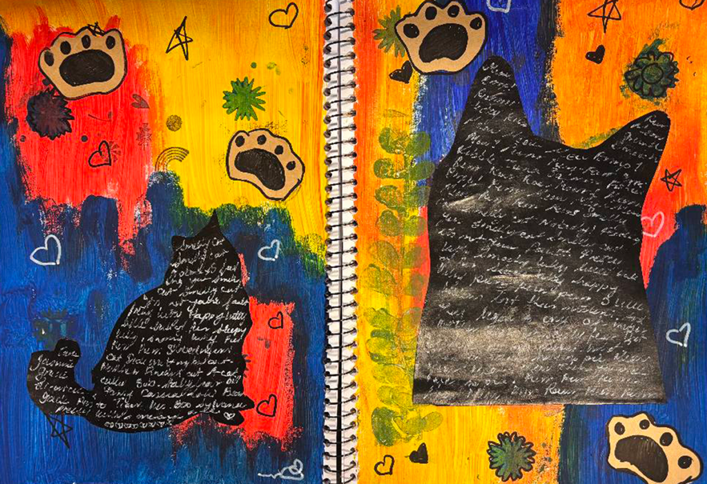 Studio Blog Creating backgrounds with acrylic paint, some reverse stenciling and mark making over the paint and finished off with a silhouette image filled with text.New techniques explored and lots of fun had creating these journal spreads Top