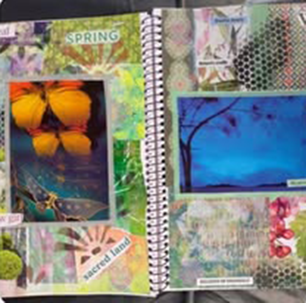 Studio Blog Using the prompt “Your Happy Place” Art Journal participants created their spreads using napkins. Removing the backing sheets from the napkins then using a liquid style gel medium or craft glue and a soft brush to stick them in place. Tissue paper, collage, stencilling and stamps were used to create a seamless transition […]