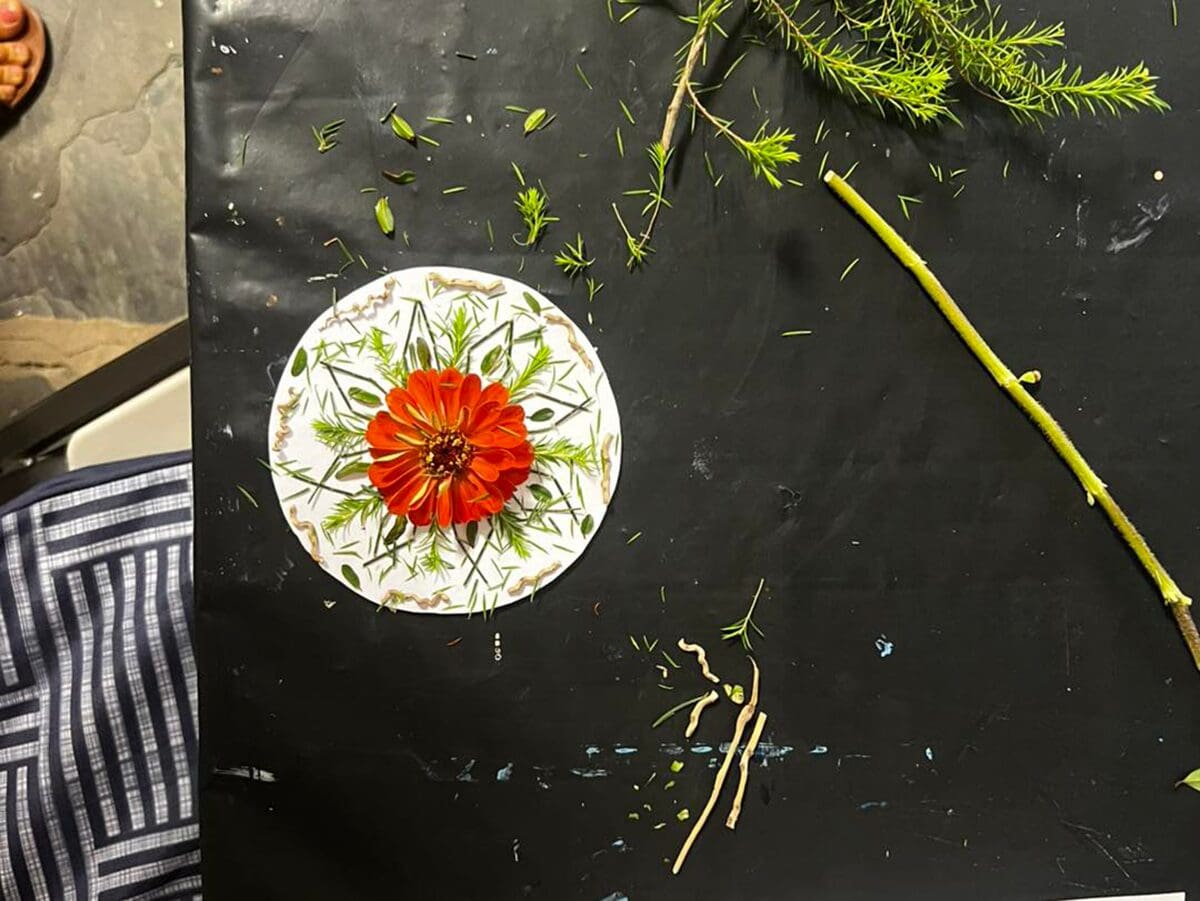In this week’s Natural Fibres / Floristry class, we created a large group mandala using leaves, flowers, gum nuts and more, gathered from nature.
