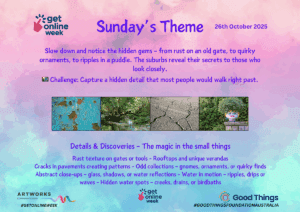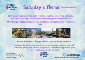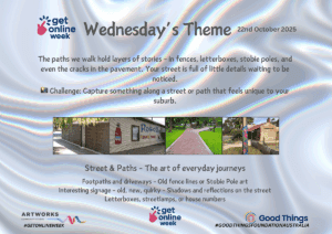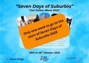 Exciting news Artworks Community Studio’s “Get Online Week 2025” activity is happening again.“Seven Days of Suburbia – Photo Challenge” We start of on the Monday