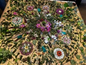 Studio Blog In this week’s Natural Fibres / Floristry class, we created a large group mandala using leaves, flowers, gum nuts and more, gathered from