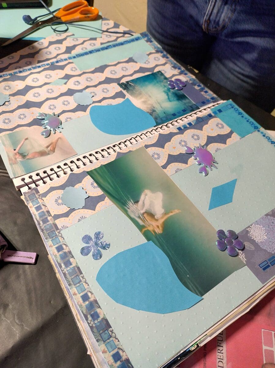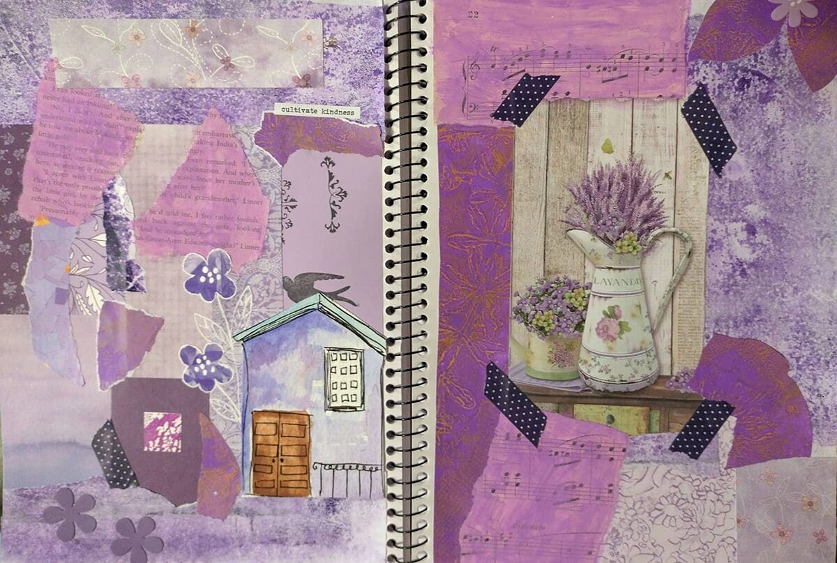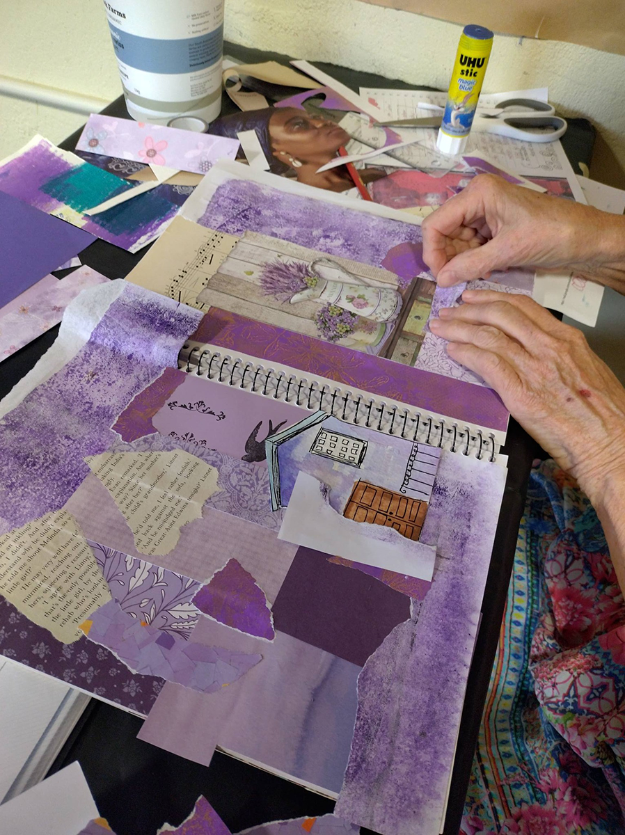 Then we layered these pieces to build a rich collage — overlapping, tearing, arranging and experimenting to create depth and interest while keeping the page focused on just one colour.