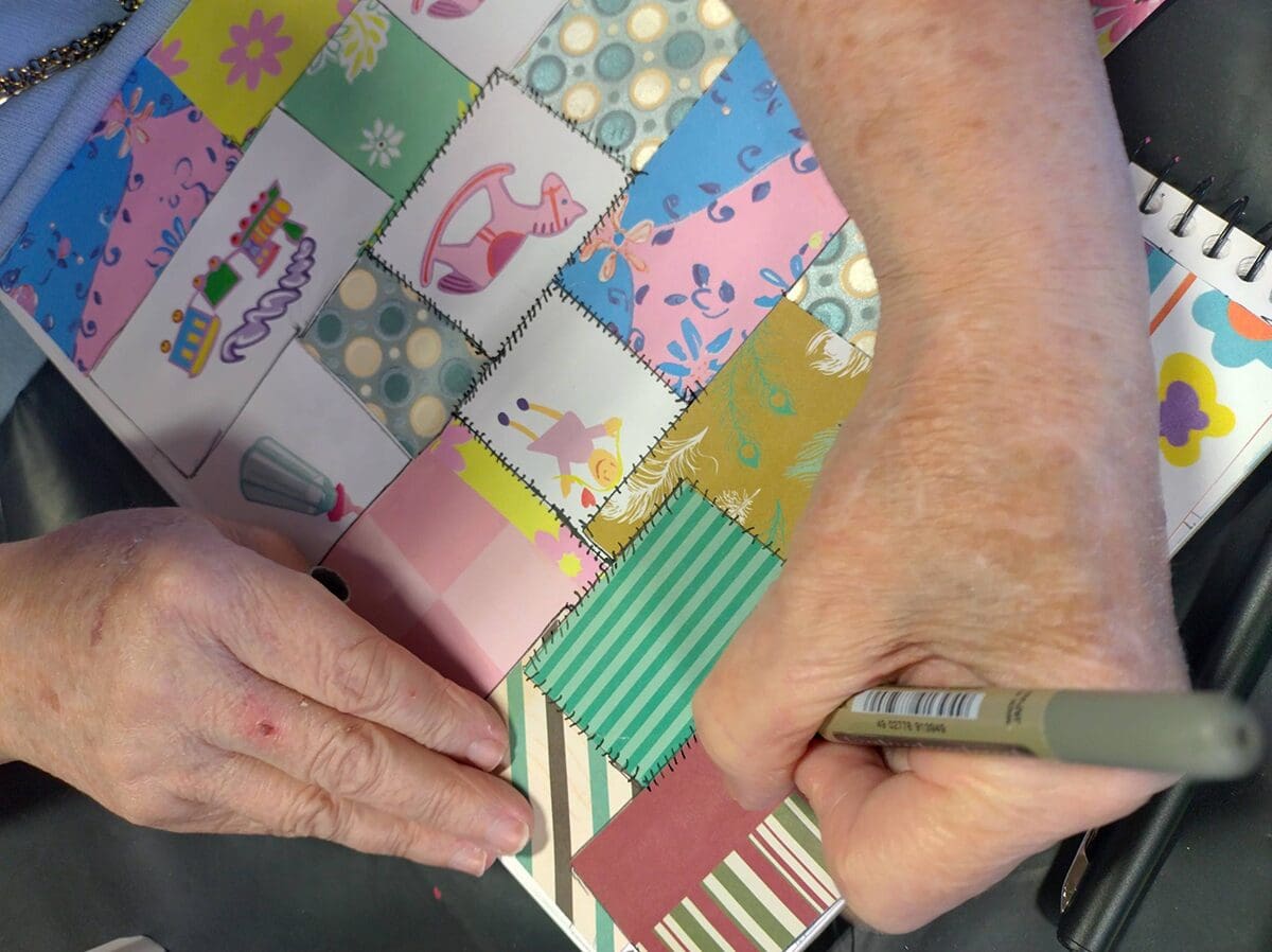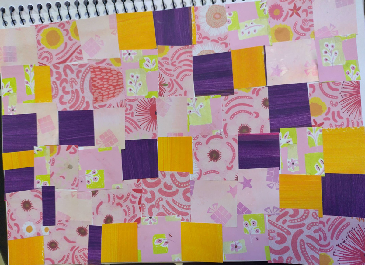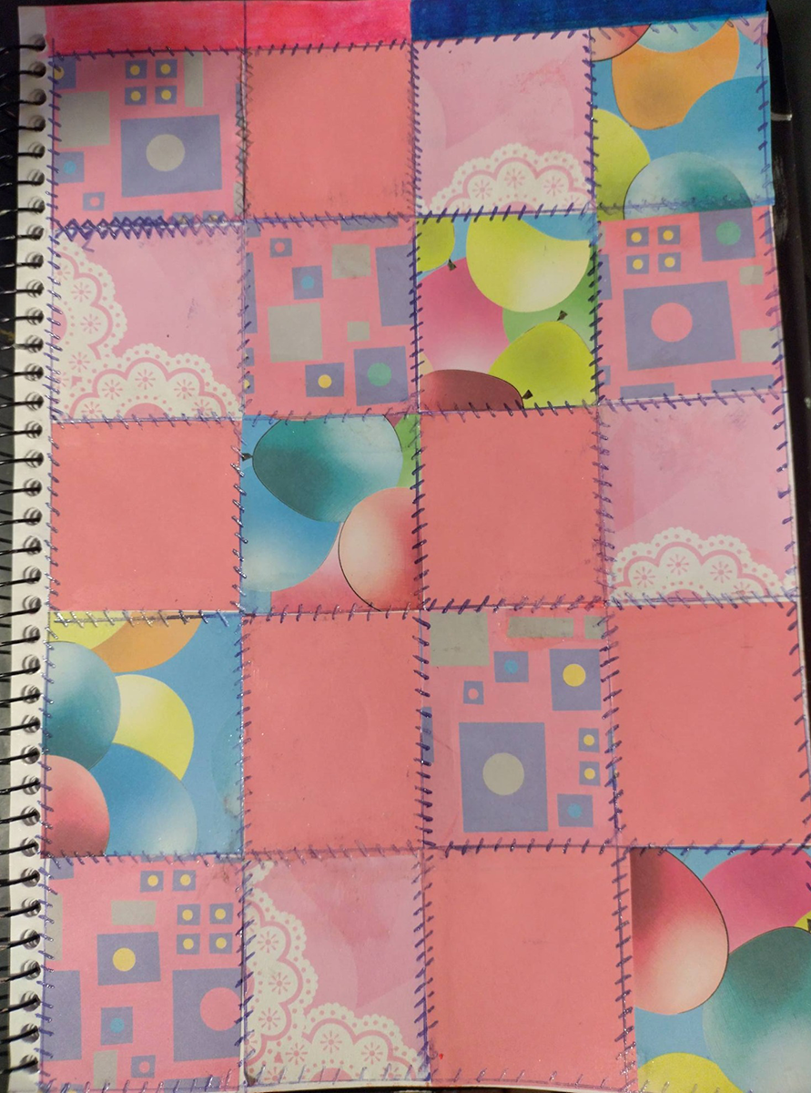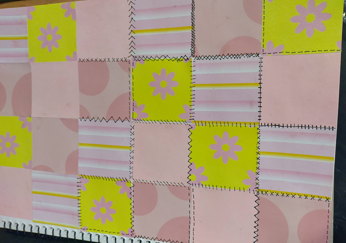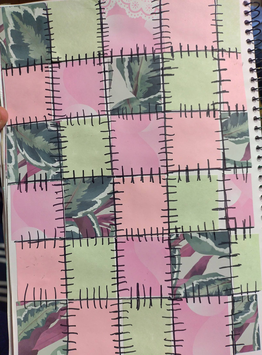 This week was all about texture, layering, and storytelling through mixed media. We created a patchwork quilt–inspired page using an assortment of papers—each piece carefully chosen and arranged to build a sense of cohesion from contrast. To bring everything together, we added hand-drawn sewing stitches, exploring how simple marks can mimic thread and evoke the warmth and nostalgia of traditional quilting.
